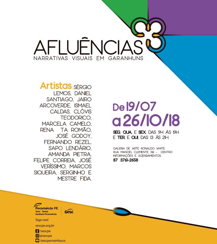 Entre os dias 19/07 a 29/09 moradores de Garanhuns, turistas e visitantes terão a oportunidade de conhecer um pouco mais os artistas visuais da cidade. É que entrará em cartaz, na galeria Ronaldo White, que fica no Sesc da Cidade, “Afluências”, exposição que faz parte da programação montada pela unidade para a 28ª edição do Festival de Inverno, que ocorrerá entre os dias 19 a 28 de julho.
