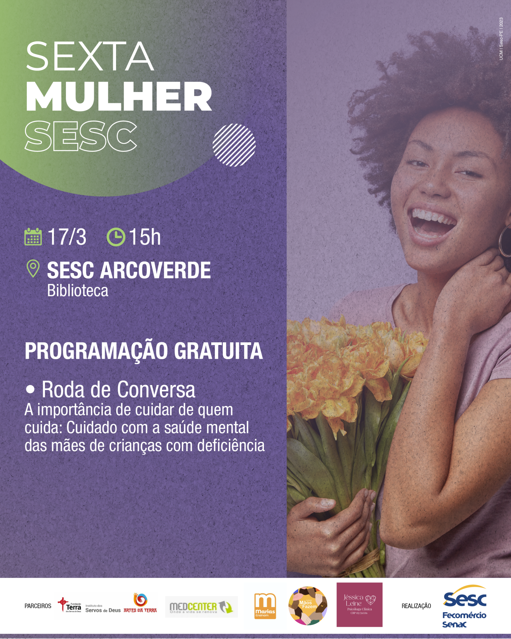 No dia 17, às 15h, na Biblioteca José Lins do Rêgo, que fica no Centro Educacional Maria Vitória Lima dos Santos, a Escola Sesc, a psicóloga clínica Jéssica Leine e a pedagoga Ceiça Lucas, proprietária da Marias Ensina, comandam a roda de conversa “A Importância de Cuidar de Quem Cuida: cuidado com a saúde mental de mães de crianças com deficiência”.