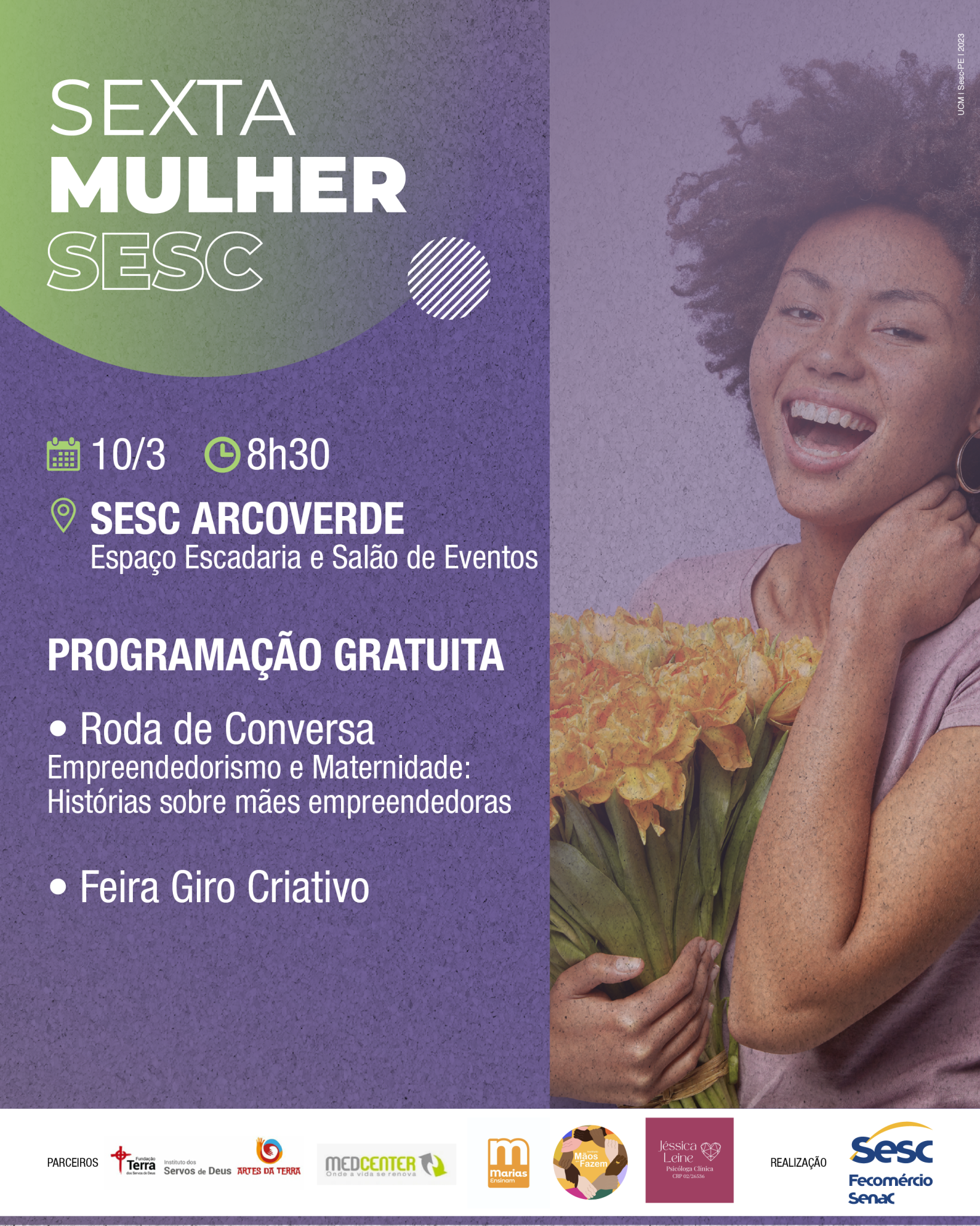 Nesta sexta (10), às 8h30, no Espaço Escadaria, acontece a roda de conversa “Empreendedorismo e Maternidade: Histórias sobre Mães Empreendedoras”, com a pesquisadora e diretora de teatro Jéssica Mendes, supervisora de Cultura do Sesc Arcoverde, e a empresária e administradora Jussara Pereira. Também vai ser realizada a Feira Giro Criativo, no Salão de Festas, com a produção de artesãs e empreendedoras de Arcoverde.