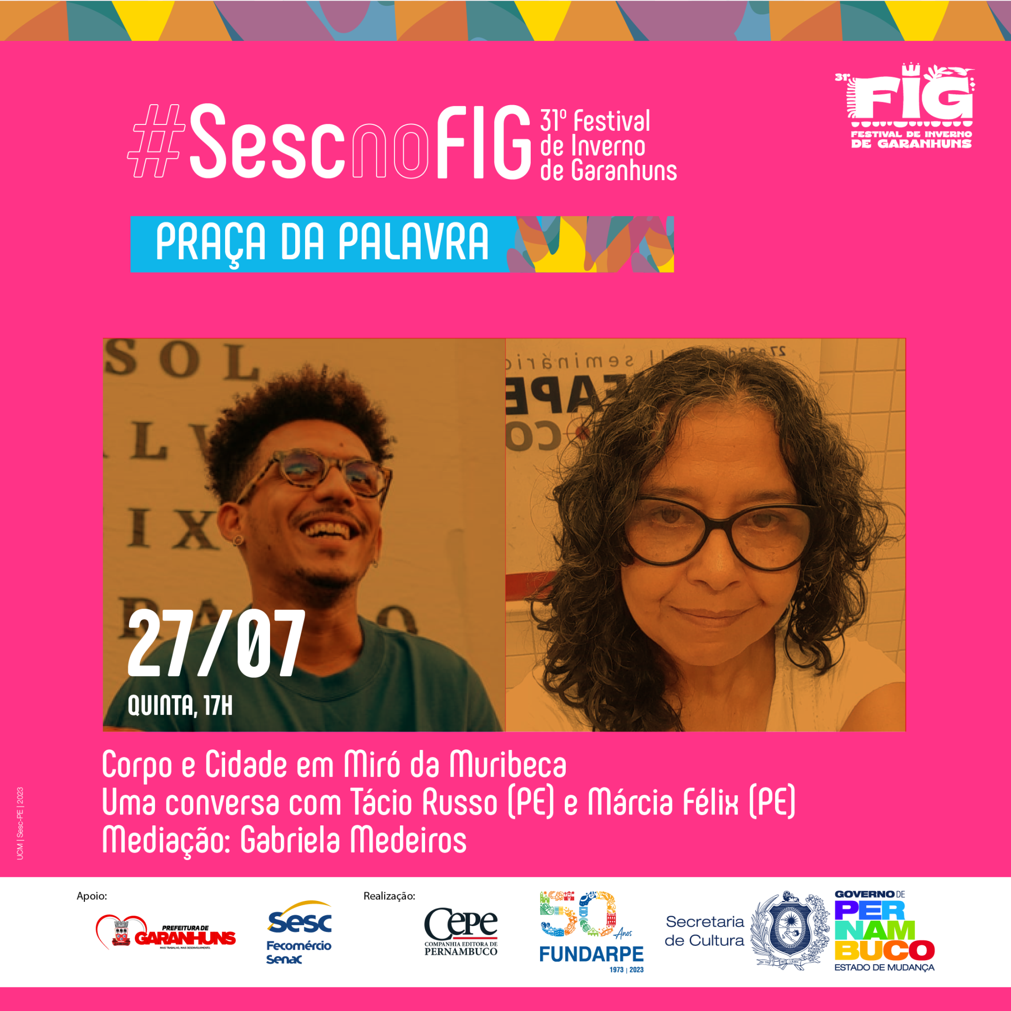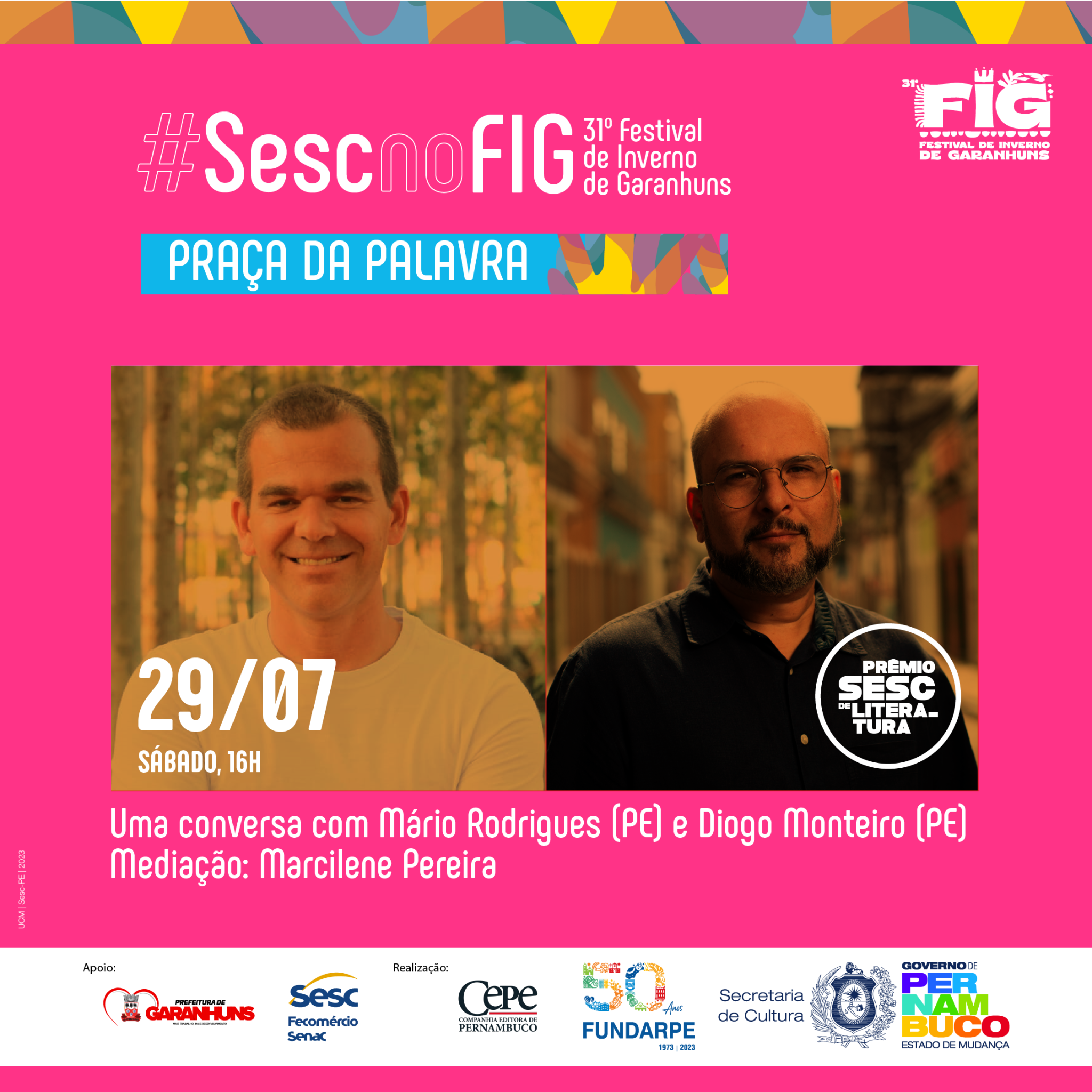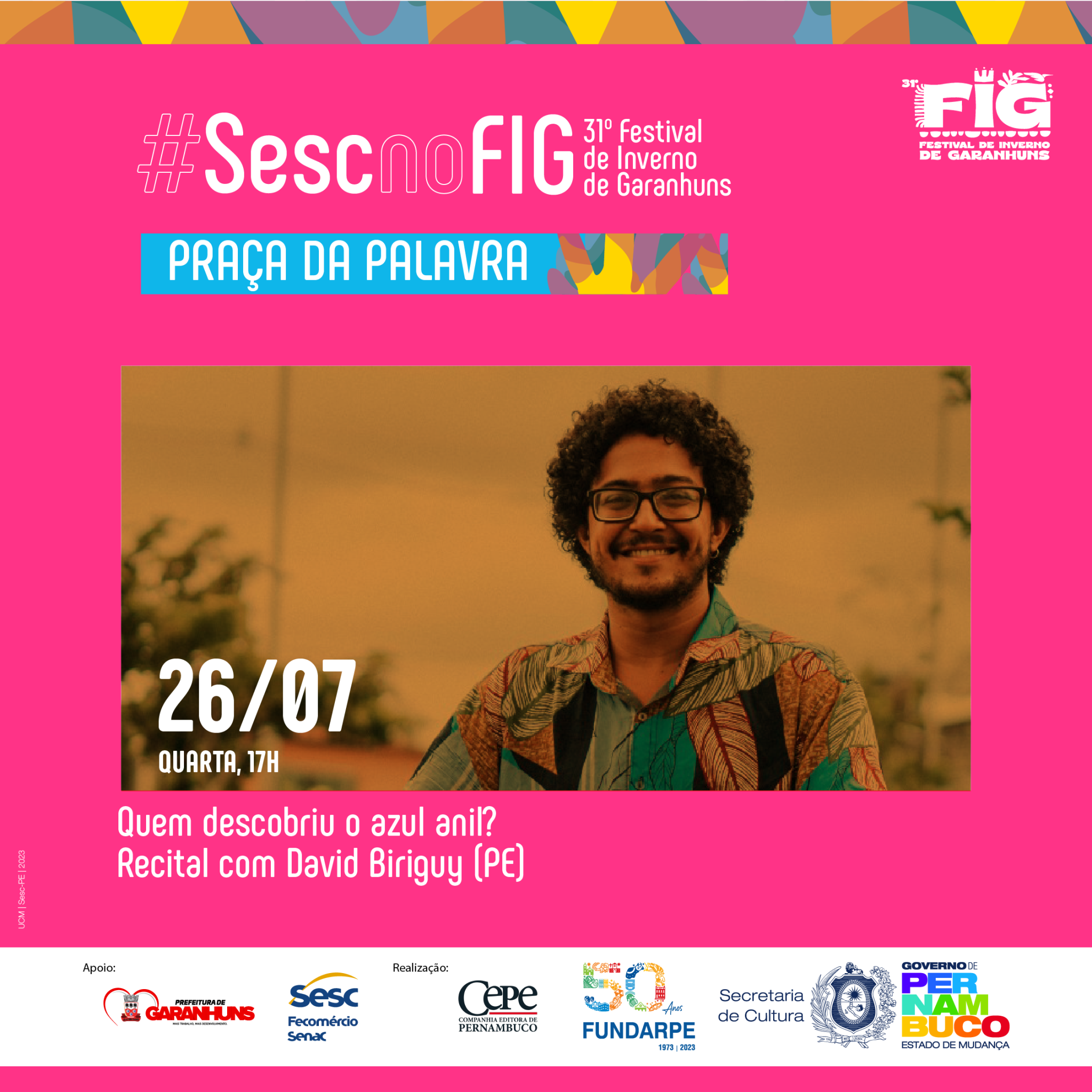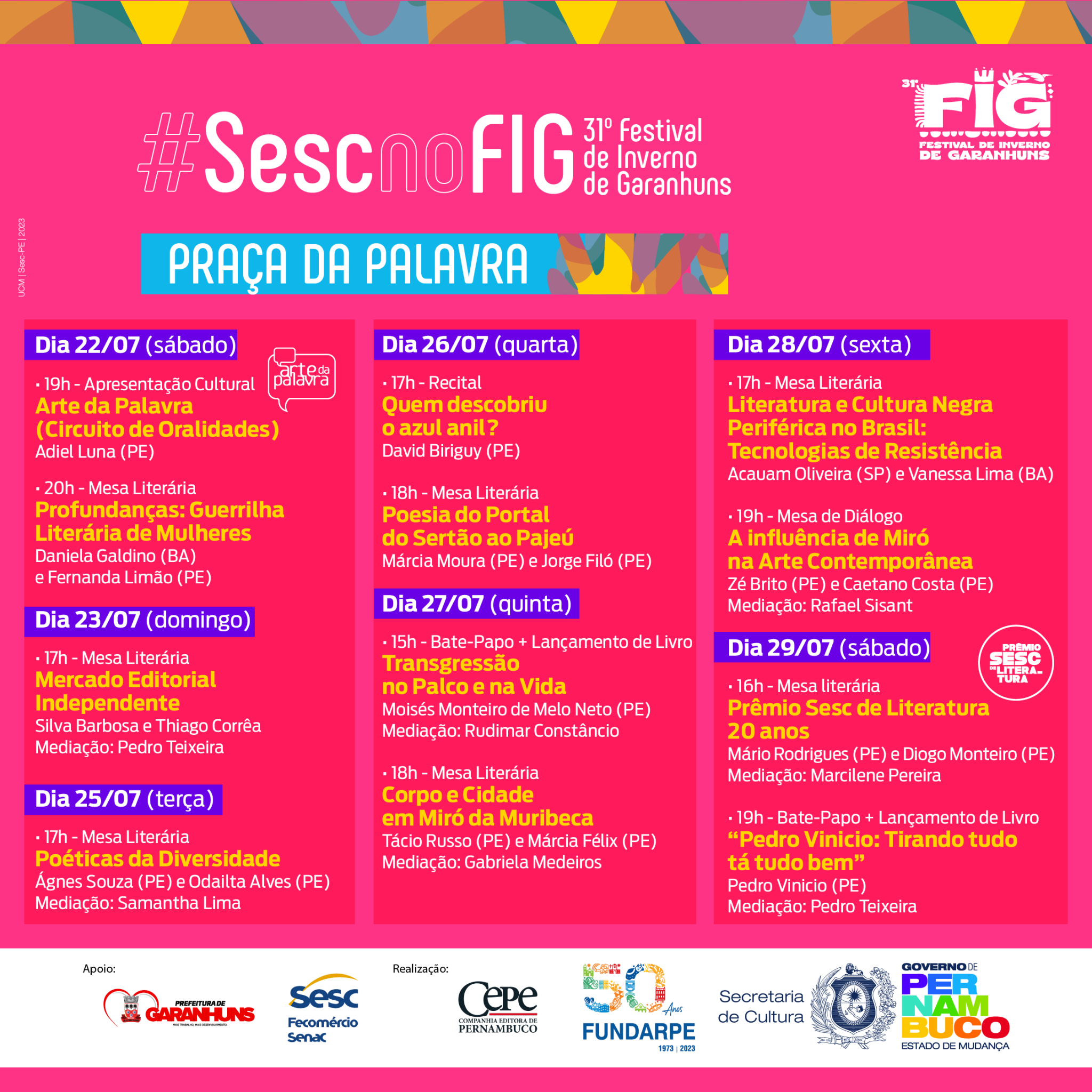 “O FIG é um importante evento para projetar o trabalho realizado há mais de 15 anos pelo Laboratório de Autoria Literária Luzinette Laporte, do CPC Sesc Garanhuns, que desenvolve ações sistemáticas de fruição e formação na área da literatura ao longo dos anos. Nesta edição, estaremos com uma mesa sobre o Prêmio Sesc de Literatura – que em 2023 completou duas décadas – e um circuito especial do projeto Arte da Palavra. Além disso, estaremos com um stand institucional e uma expressiva programação dedicada ao homenageado da praça, Miró da Muribeca, que merece todo destaque e reconhecimento por sua contribuição para a literatura brasileira”, explica Pedro Teixeira, técnico de Literatura do Sesc PE.