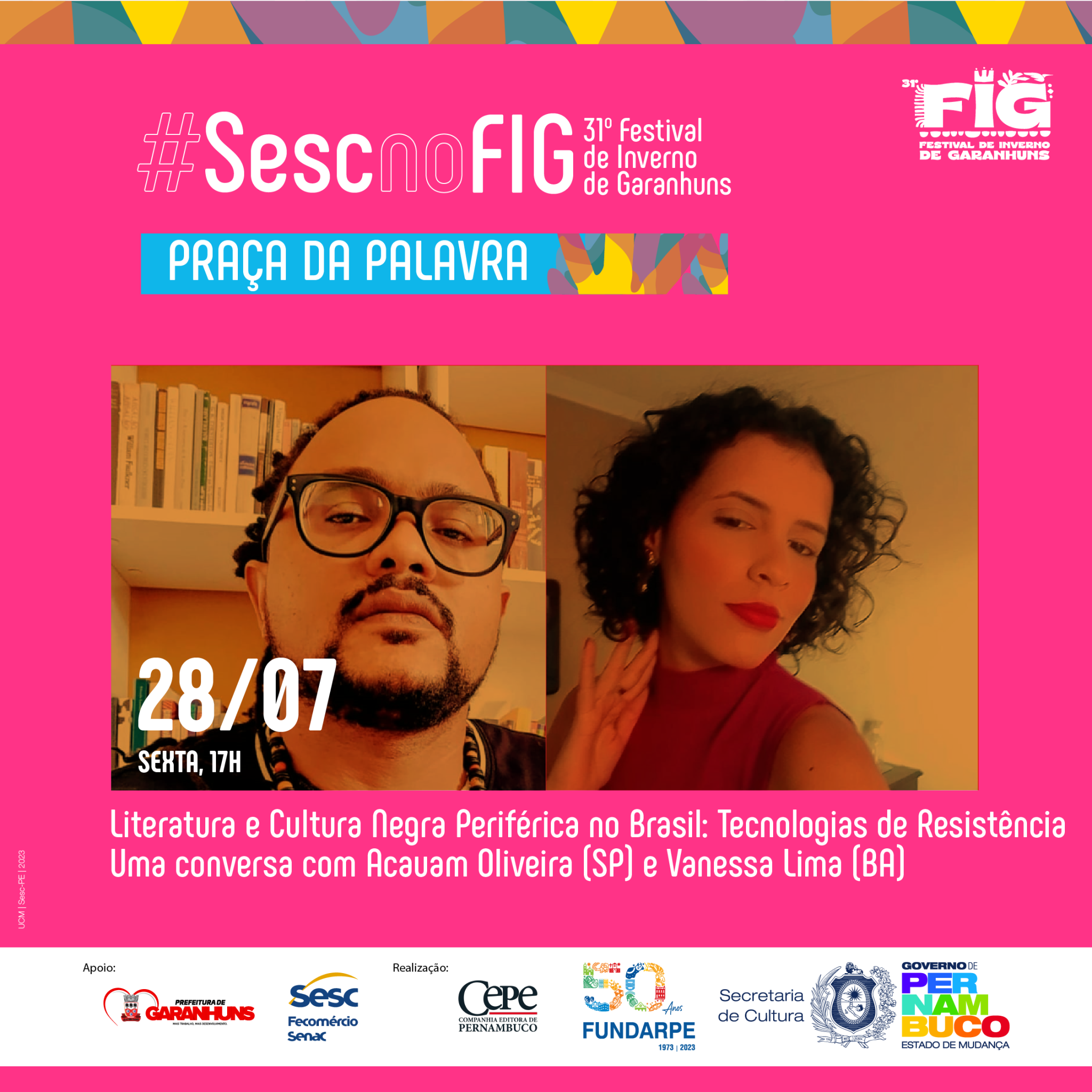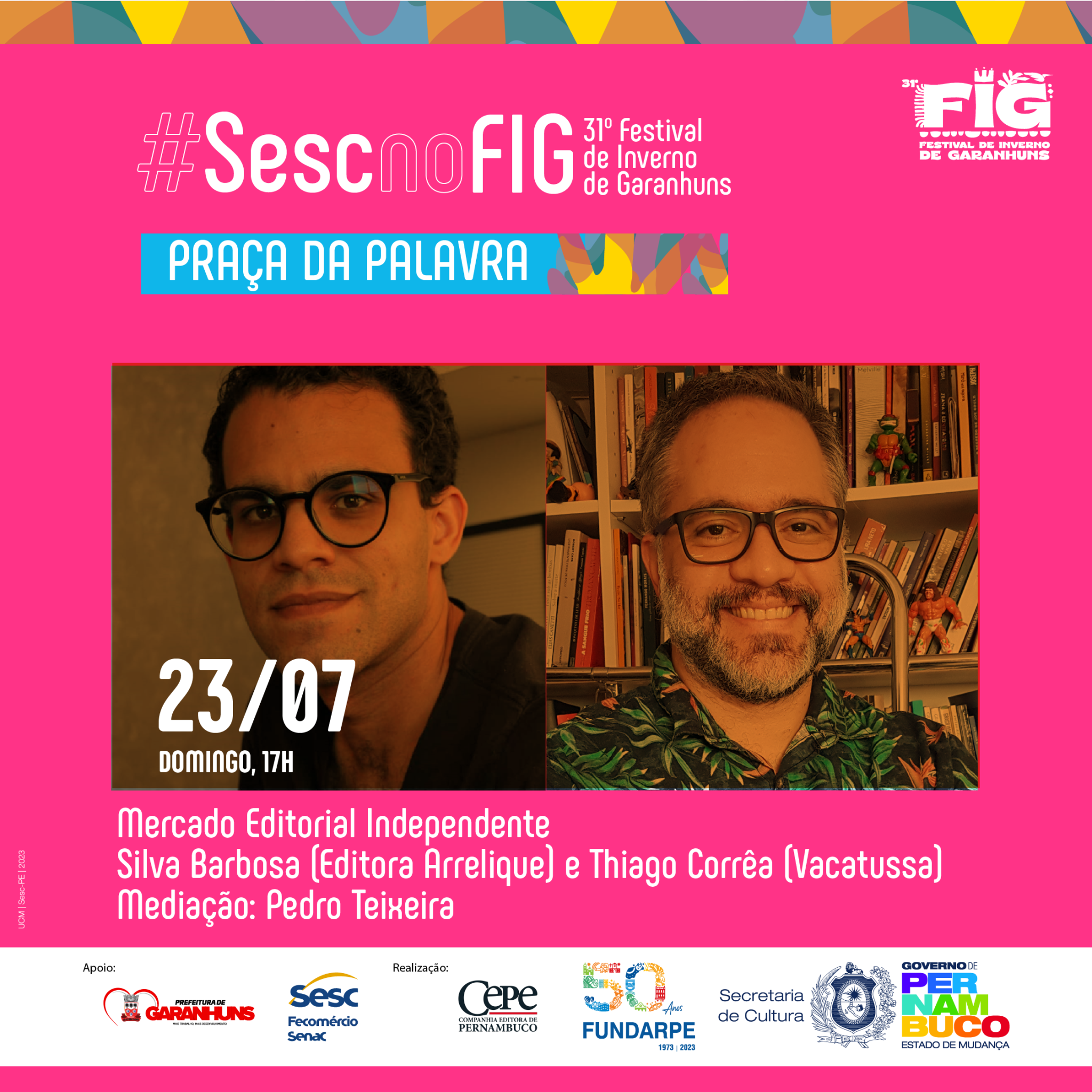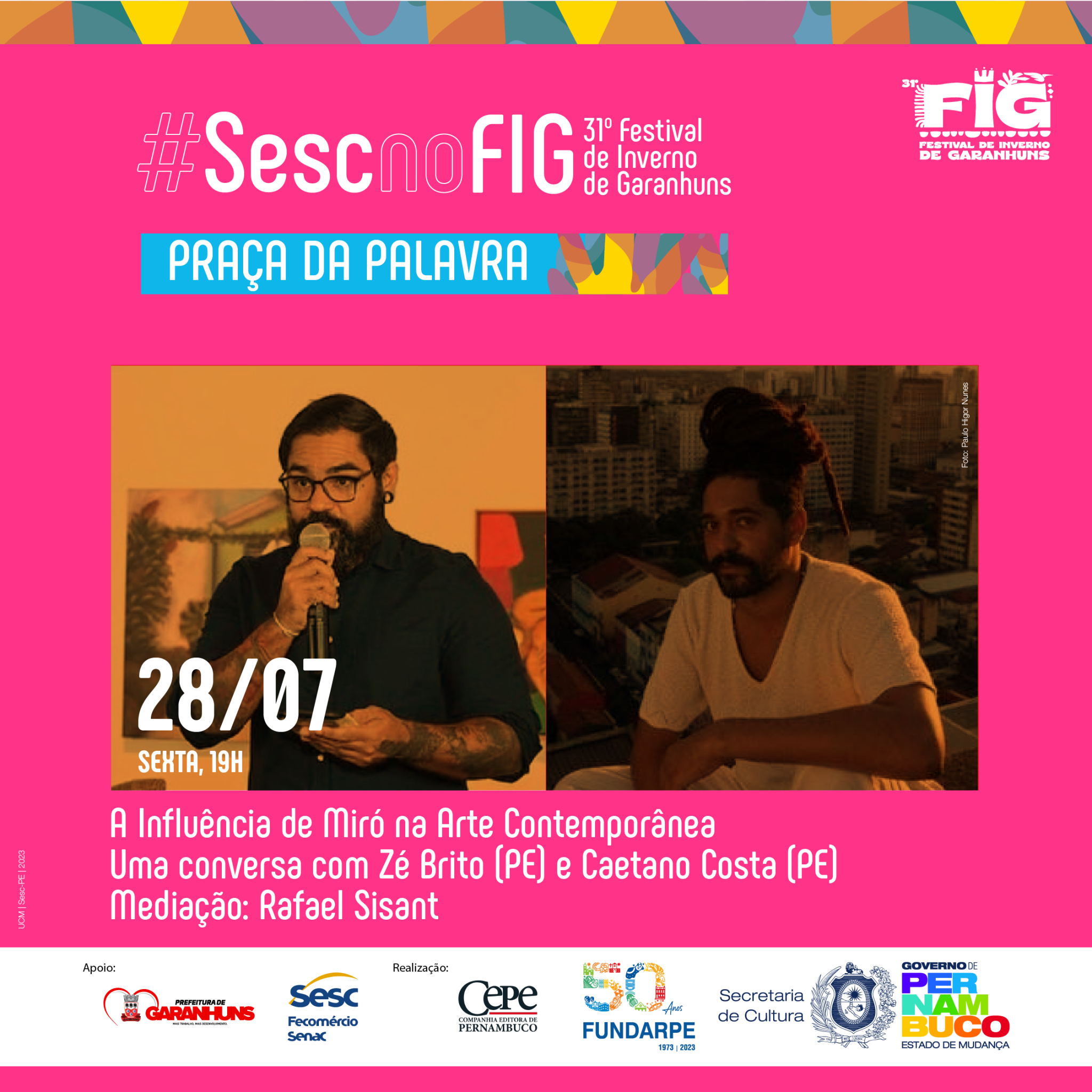 “O FIG é um importante evento para projetar o trabalho realizado há mais de 15 anos pelo Laboratório de Autoria Literária Luzinette Laporte, do CPC Sesc Garanhuns, que desenvolve ações sistemáticas de fruição e formação na área da literatura ao longo dos anos. Nesta edição, estaremos com uma mesa sobre o Prêmio Sesc de Literatura – que em 2023 completou duas décadas – e um circuito especial do projeto Arte da Palavra. Além disso, estaremos com um stand institucional e uma expressiva programação dedicada ao homenageado da praça, Miró da Muribeca, que merece todo destaque e reconhecimento por sua contribuição para a literatura brasileira”, explica Pedro Teixeira, técnico de Literatura do Sesc PE.