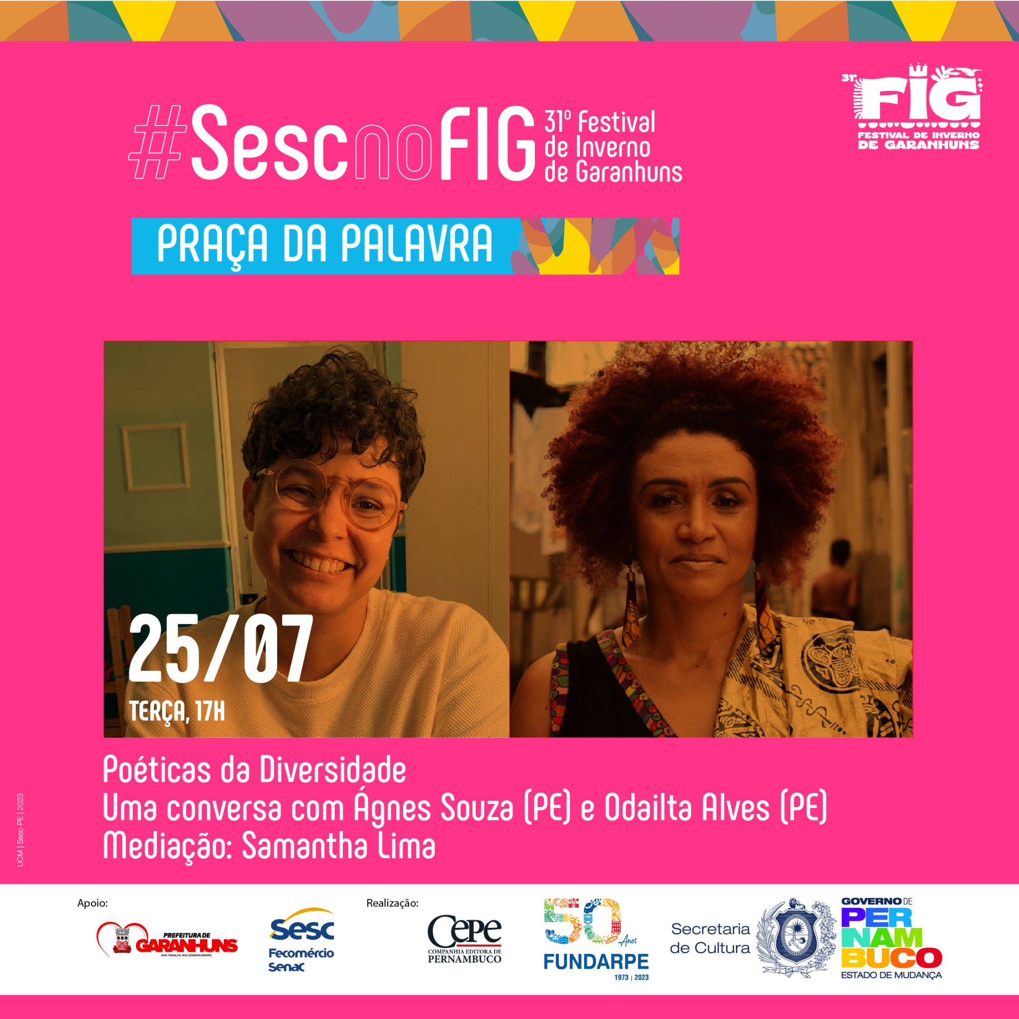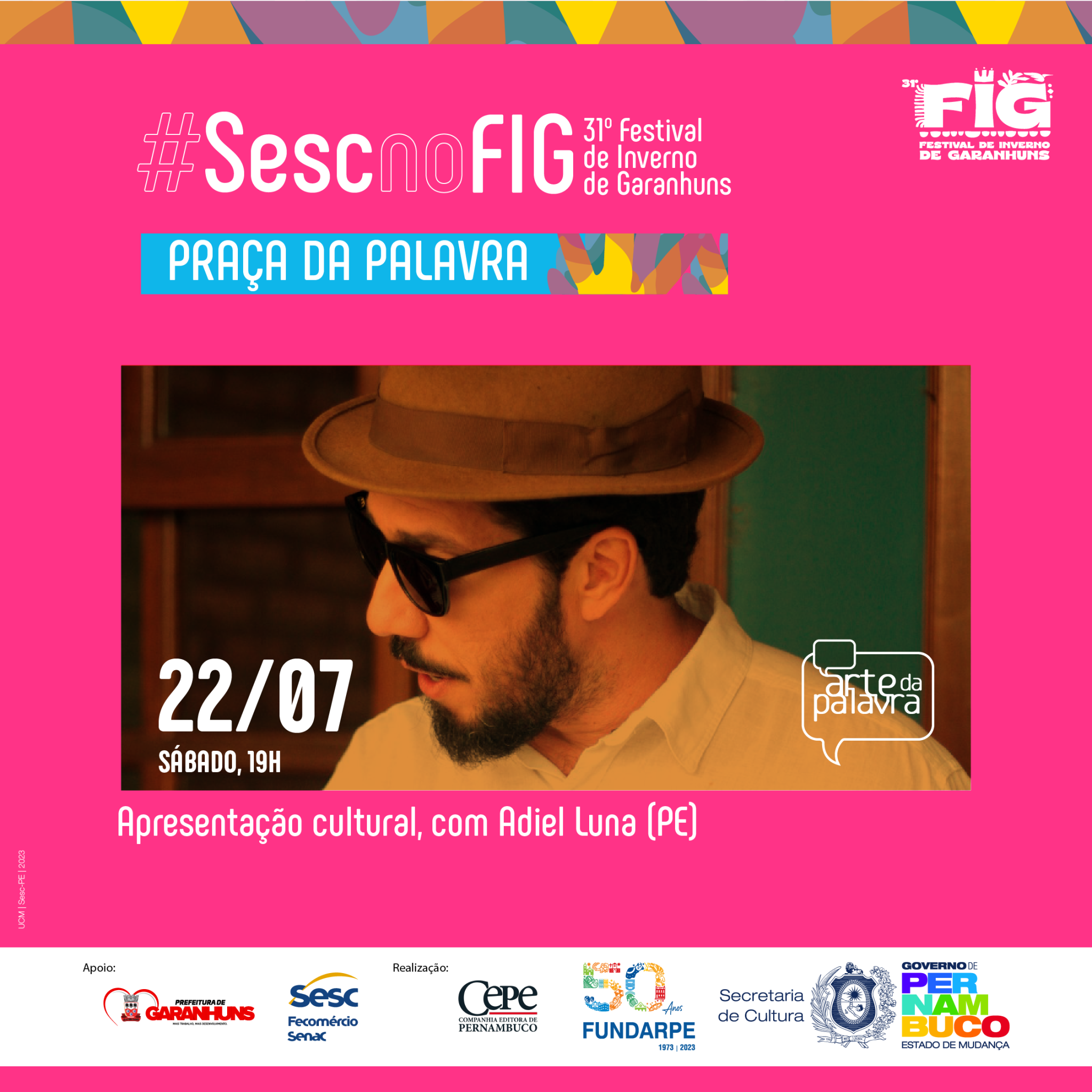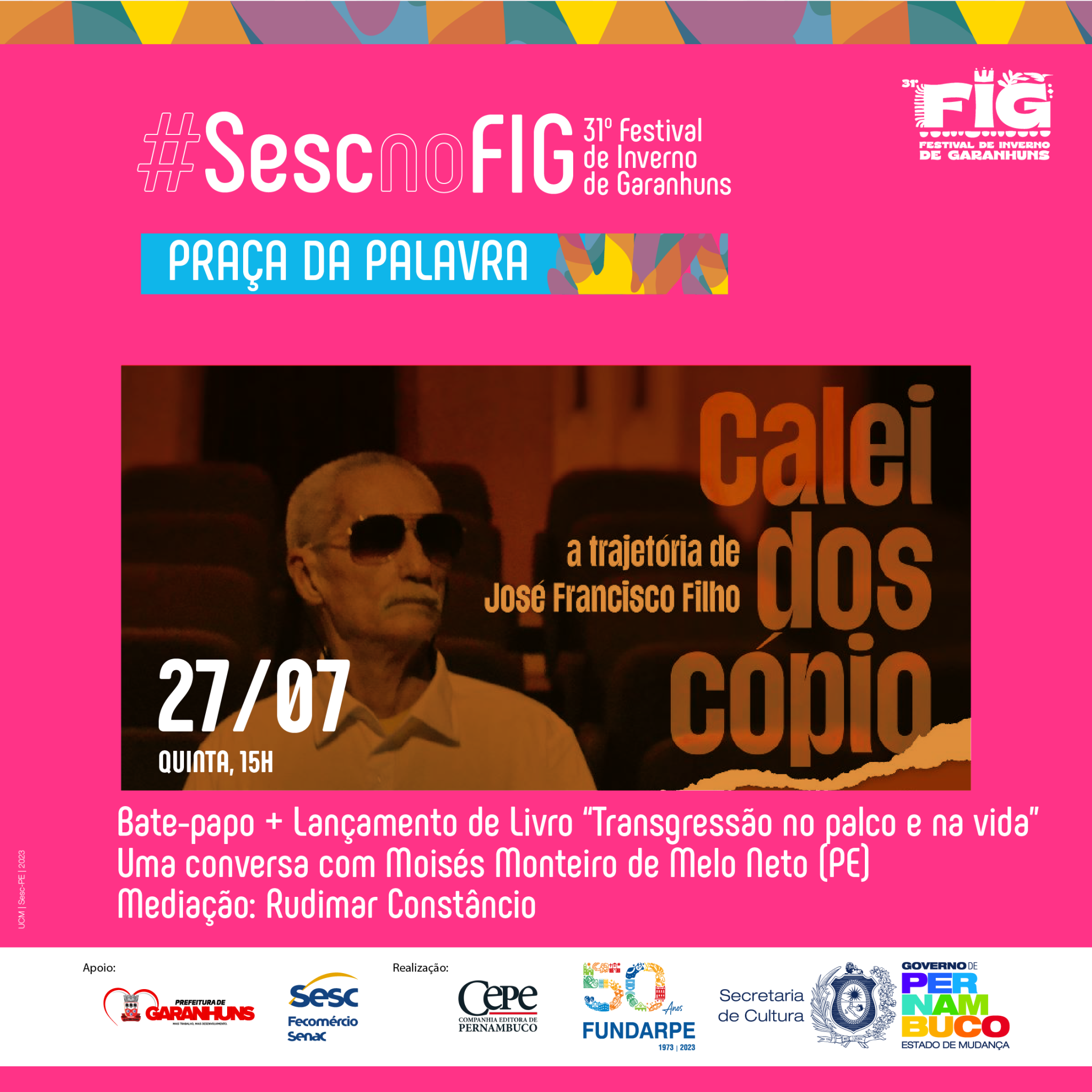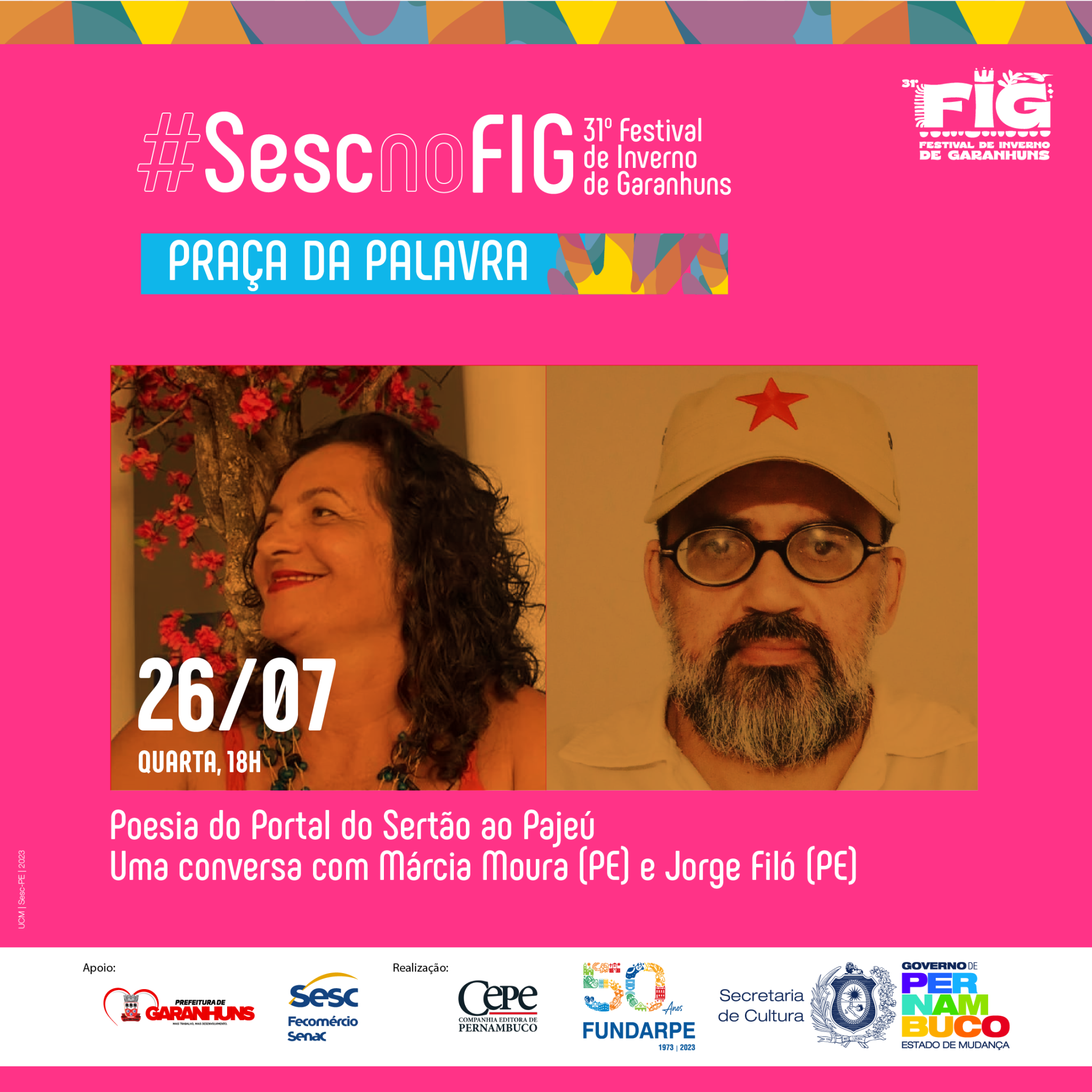 “O FIG é um importante evento para projetar o trabalho realizado há mais de 15 anos pelo Laboratório de Autoria Literária Luzinette Laporte, do CPC Sesc Garanhuns, que desenvolve ações sistemáticas de fruição e formação na área da literatura ao longo dos anos. Nesta edição, estaremos com uma mesa sobre o Prêmio Sesc de Literatura – que em 2023 completou duas décadas – e um circuito especial do projeto Arte da Palavra. Além disso, estaremos com um stand institucional e uma expressiva programação dedicada ao homenageado da praça, Miró da Muribeca, que merece todo destaque e reconhecimento por sua contribuição para a literatura brasileira”, explica Pedro Teixeira, técnico de Literatura do Sesc PE.