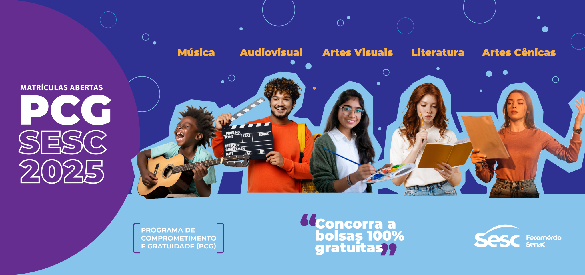 Com o objetivo de contribuir para a formação artística e facilitar o acesso da população de baixa renda à cultura, o Sesc Pernambuco lança mais uma edição do Programa de Comprometimento e Gratuidade (PCG) nesta segunda-feira (10/03), oferecendo 478 vagas gratuitas, com oportunidades para turmas de Artes Cênicas (185), Artes Visuais (33), Audiovisual (21), Literatura (64) e Música (175), para todas as idades.