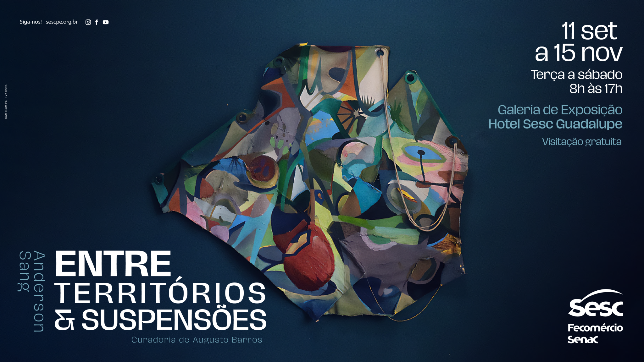 Pinturas que brotam da terra com folhas, frutos e raízes, trazendo vida para as telas. É assim que se pode descrever a exposição Entre Territórios e Suspensões, mais novo trabalho do artista plástico Anderson Sang que desembarca na galeria do Hotel Sesc Guadalupe, localizado em Sirinhaém, litoral sul do estado, de 11 de setembro a 15 de novembro.