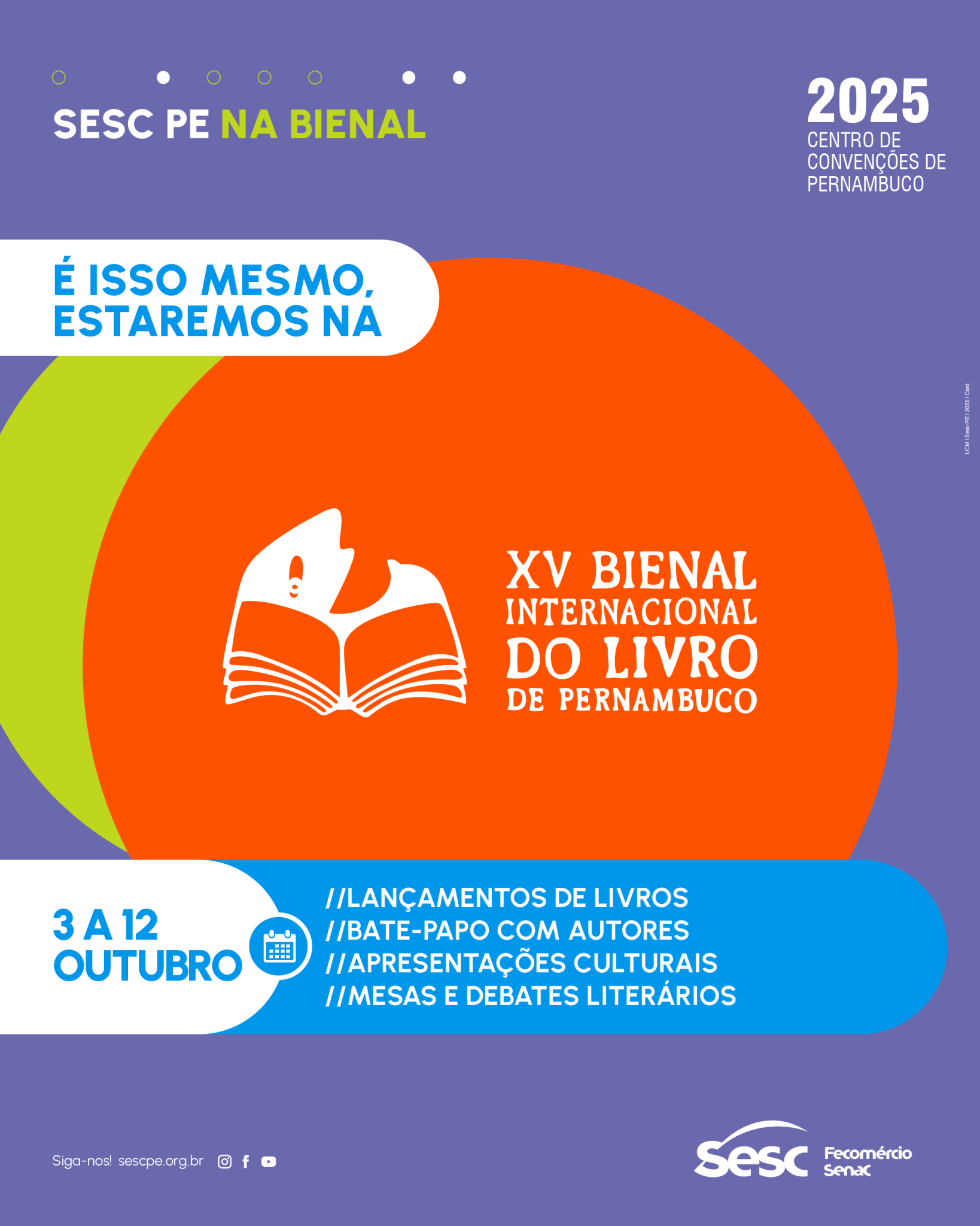 O Centro de Convenções de Pernambuco sediará a décima quinta edição Bienal Internacional do Livro de Pernambuco, evento já tradicional e central para quem vive o mundo literário no estado. O Sesc Pernambuco estará presente durante os dias de programação, de 3 a 12 de outubro, levando mais de 30 atividades, entre debates, lançamentos de livros, performances de poesia e contação de histórias.
