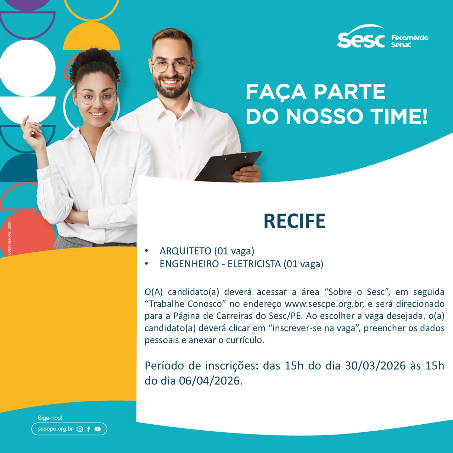 O Sesc Pernambuco está com inscrições abertas para processo seletivo com oportunidades em Recife, nas áreas de Arquitetura e Engenharia.